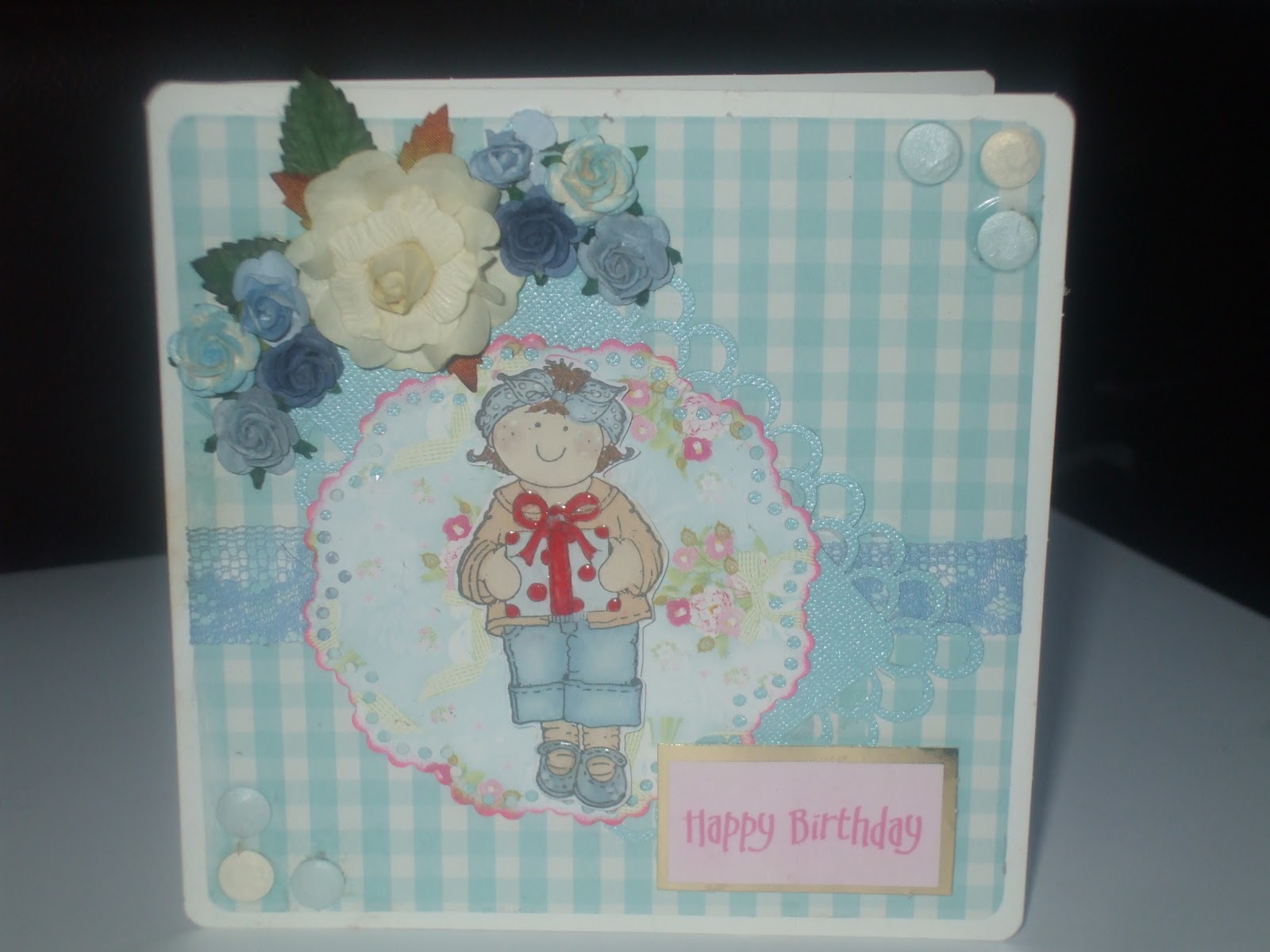This is the card i sent to Susan aka TomsMom for her birthday. I used the little girl from the free Molly Bloom stamps from a magazine. She is coloured with promarkers and layered on to a Nellie doily which was cut from paper from Wild Rose Studio. The blue backing paper is Papermania.